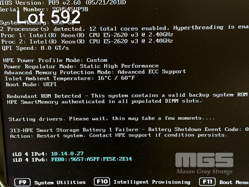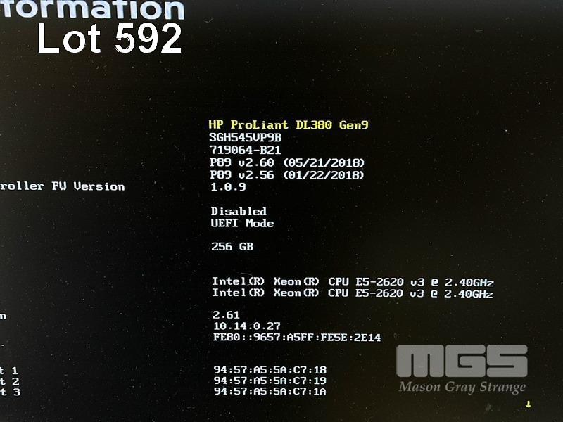RACKMOUNT SERVER, HP PROLIANT DL380 Gen9, 2U, 2 x XEON E5-2620 v3 @ 2.4GHz, 256GB ECC DDR4 RAM (16x16GB), 2 x 146GB SAS HDD, 2-PORT 561FLR-T 10Gb ADAPTER, 2-PORT 560SFP+ 10Gb ADAPTER, 2-PORT STORE FABRIC 8Gb FC, 2 x 500W PSU WITH RAILS (NO CABLES) (NOTE: MESSAGE "SMART STORAGE BATTERY 1 FAILURE") S/N:SGH545VP9B