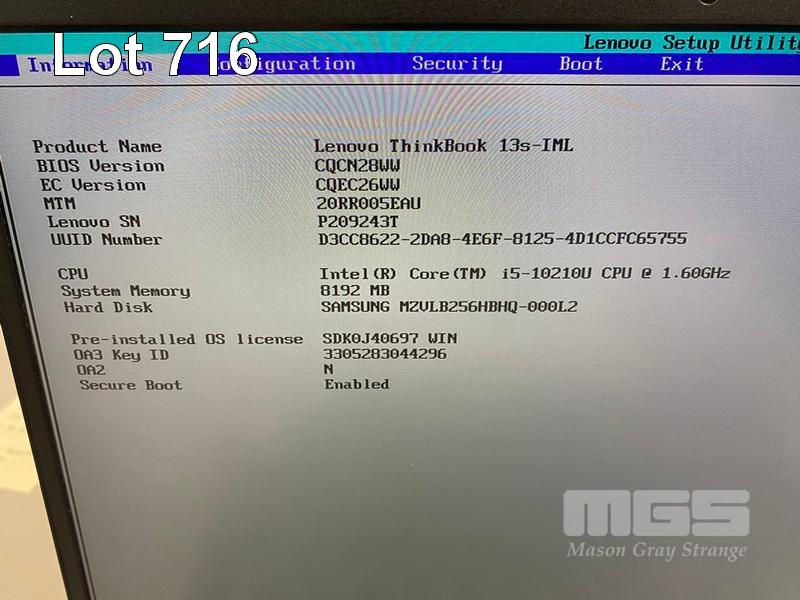 LAPTOP, LENOVO THINKBOOK 13s-IML, TYPE 20RR, CORE i5 10210U (10TH GEN) @ 1.6GHz, 8GB DDR4 RAM, 256GB NVMe M.2 SSD, 13.3" WIDESCREEN (1920x1080), INTEL UHD GRAPHICS, Wi-Fi, BLUETOOTH, WINDOWS 11 PRO INSTALLED & POWER SUPPLY (NOTE: MINOR DENTS IN CASING) S/N:P209243T