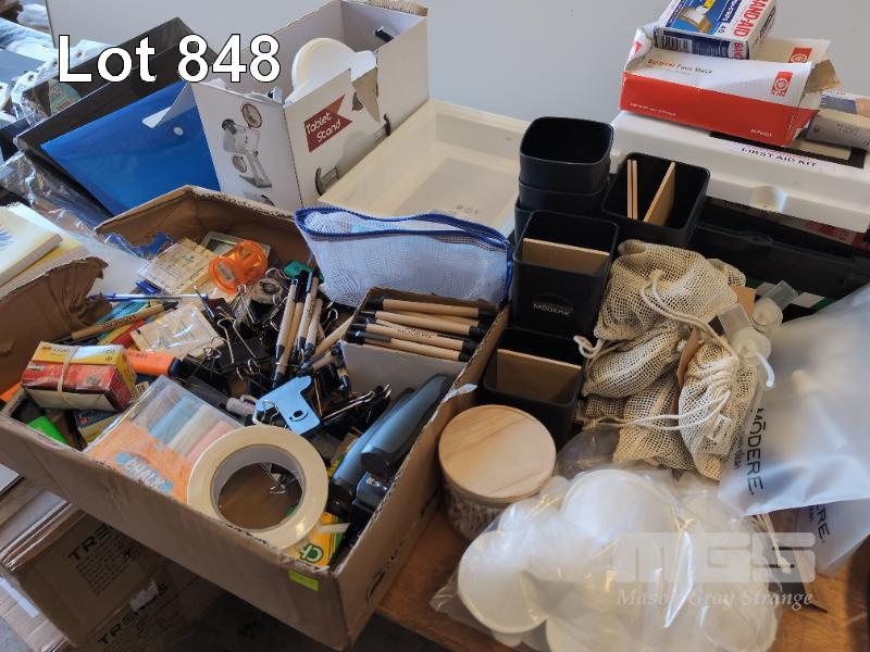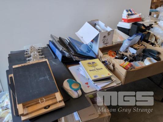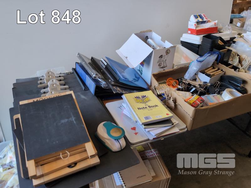 QTY OFFICE STATIONARY SUPPLIES. INC FIRST AID KIT, CLIPBOARDS (VARIOUS SIZES), MINI CHALK BOARDS, TABLET STAND & QTY BRANDED NOTEBOOKS. ETC.