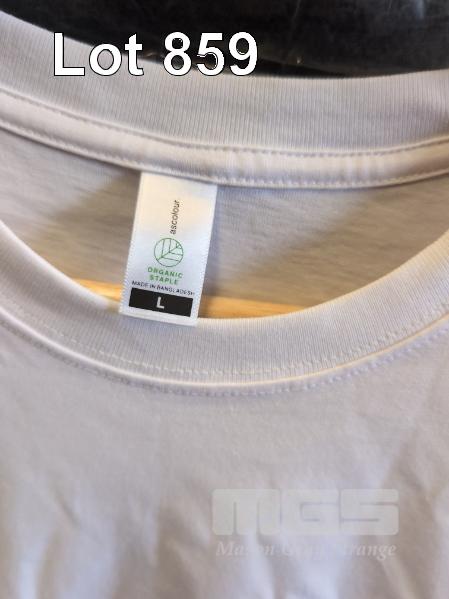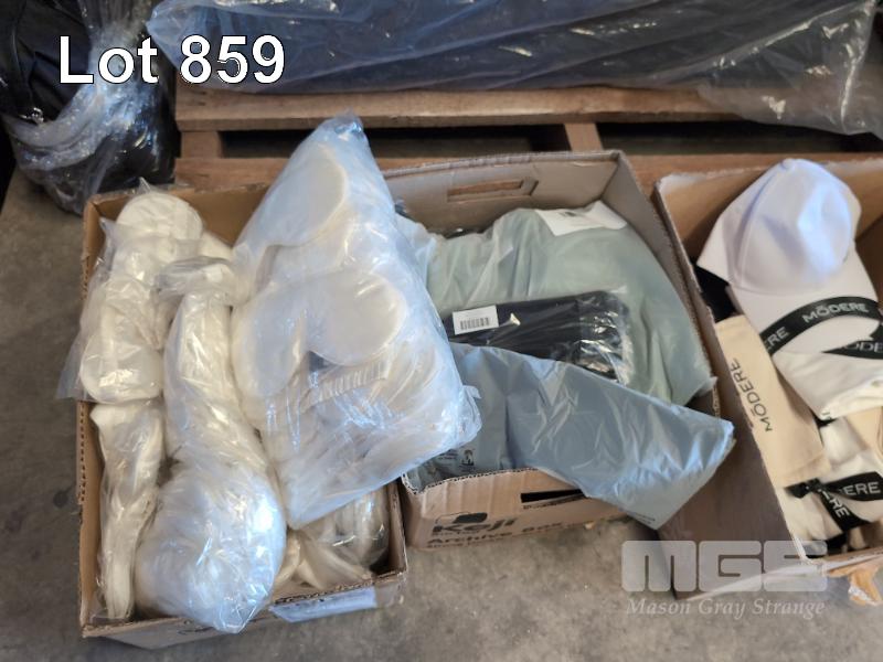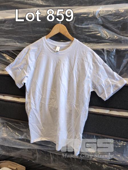 QTY PLAIN WHITE T-SHIRTS VARIOUS SIZES SMALL - XXL. QTY EYE MASKS & OTHER ASSORTED BRANDED CLOTHING.
