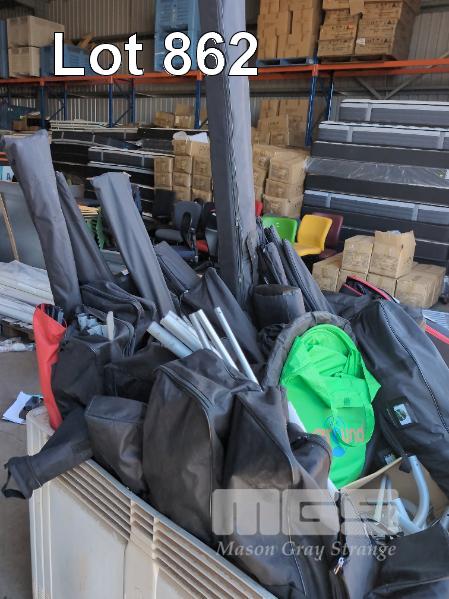 QTY BRANDED TRADE SHOW DISPLAYS. INC TEARDROP FLAGS, CARRY BAGS & OTHER (CONTENTS BIN - BIN NOT INCLUDED)
