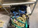 STEEL SHELF, 6 TIER & CONTENTS TIE DOWNS, LIFTING SOFT SLINGS, AIR TOOLS, 2 x IMPACT GUNS, SPRAY GUNS, STAINLESS STEEL DRIP TRAY & ROLL ORANGE PLASTIC