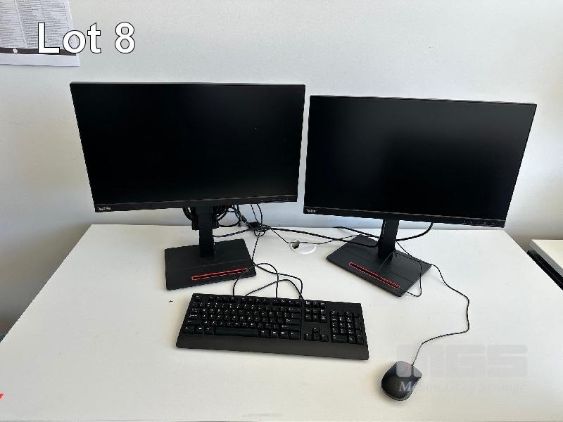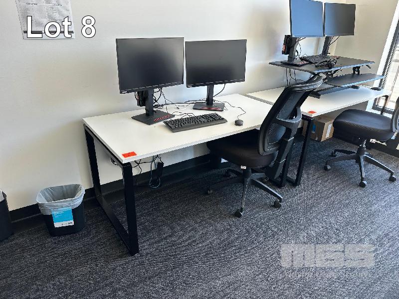 WHITE TIMBER LAMINATE DESK, 1500 x 750mm BLACK STEEL FRAME WITH BLACK CLOTH GAS LIFT CHAIR , 2 x LENOVO 24" MONITORS, MOD: T24i-20, 1 x LENOVO DOCK, GEN 2, KEYBOARD, MOUSE, CABLES & HEADSET