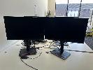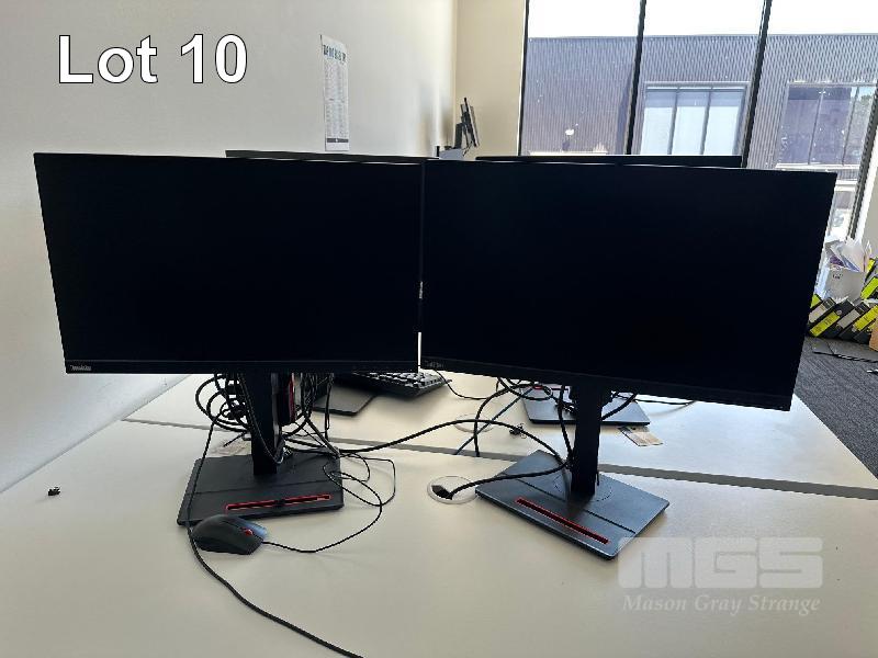 WHITE TIMBER LAMINATE DESK, 1500 x 750mm BLACK STEEL FRAME WITH BLACK CLOTH GAS LIFT CHAIR, 2 x LENOVO 24" MONITORS, MOD: T24i-20, 1 x LENOVO DOCK, GEN 2, MOUSE, CABLES