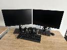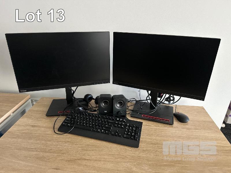 WOODGRAIN TIMBER LAMINATE DESK, WHITE STEEL FRAME 1200 x 750mm BLACK/WHITE GAS LIFT CHAIR 2 x LENOVO 24" MONITORS, MOD: T24i-20 LENOVO DOCK, GEN 2 KEYBOARD, MOUSE, SPEAKERS & HEADPHONES