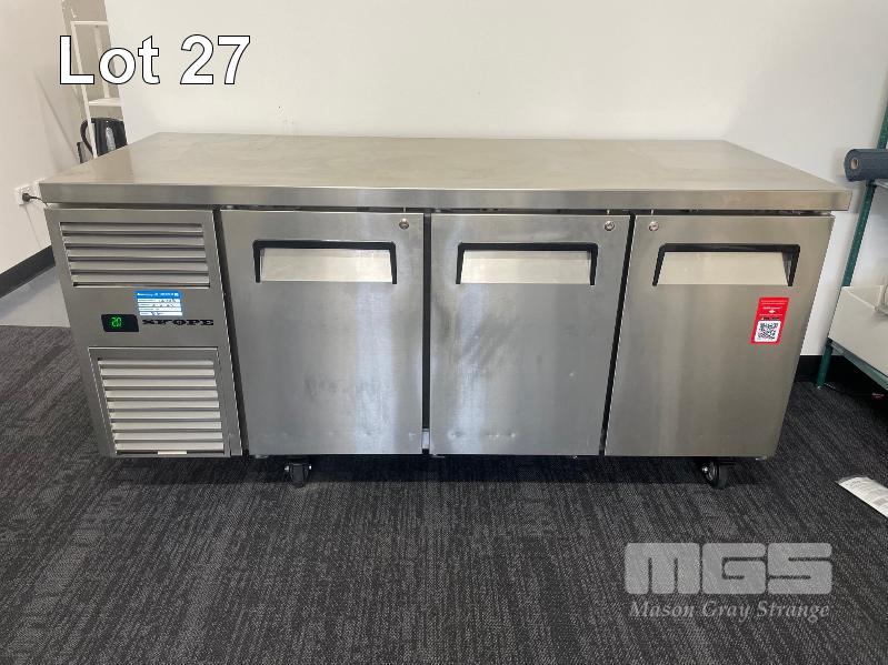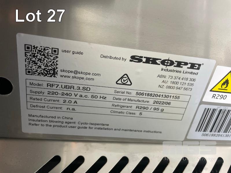 SKOPE 3 DOOR UNDER BENCH FRIDGE, DOM: 06/2022 MOD: RF7.UBR.3.SD, SERIAL: 5061882041301155, 240V 10 AMP