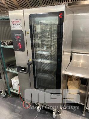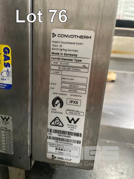 CONVOTHERM EASY DIAL NATURAL GAS COMBI OVEN, TYPE: C4eD20.10GB, SERIAL: XB721114219, POWER: 1.1kw, 238,500BTU, 20 PAN CAP ADVANCED CLOSED SYSTEM+, VARIABLE FAN SPEED, CONVO CLEAN AUTOMATIC CLEANING SYSTEM, 5 LEVELS MOISTURE CONTROL, 5 BAKING SETTINGS, 415V HARDWIRED MADE IN GERMANY WITH 19 TRANSPORT TROLLEY, 19 TRAY CAPACITY WITH 4 x STAINLESS STEEL PERFORATED GASTRONORM TRAYS, 325 x 530 x 65mm & 15 x GASTRONORM TRAYS, 325 x 530 x 65mm