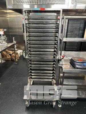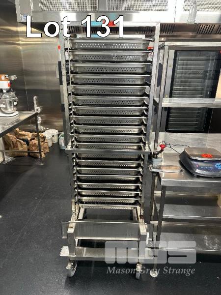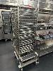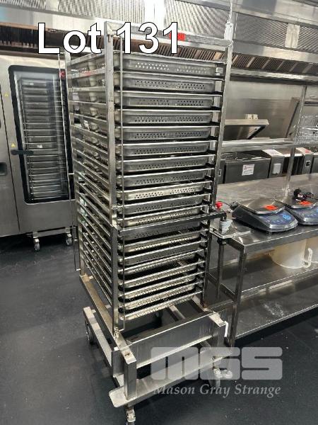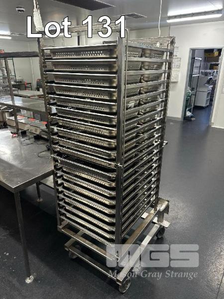 STAINLESS STEEL TROLLEY, SUIT LOTS 75 & 130, WITH 38 x PERFORATED GASTRONORM TRAYS, 530 x 235 x 65mm