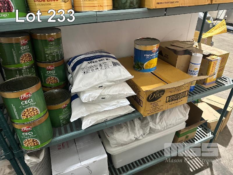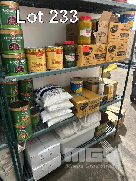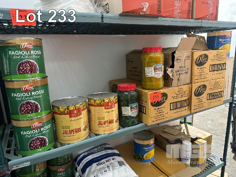 LARGE QUANTITY LONG LIFE INGREDIENTS, BEANS, JALAPENOS, PICKLES, MUSTARD, BONSOY MILK, PINEAPPLE, CHICKPEAS, CANOLA OIL, CANNELLONI, SEA SALT ETC CONTENTS SHELF UNIT