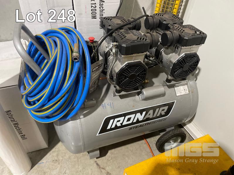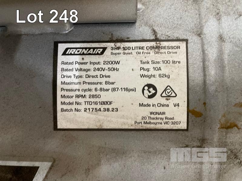 IRONAIR SILENCED AIRCOMPRESSOR, DOM: 2023, MOD: TTD161000F, 2200W, 3HP, 100L, 240V 10 AMP WITH AIR HOSE