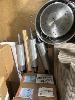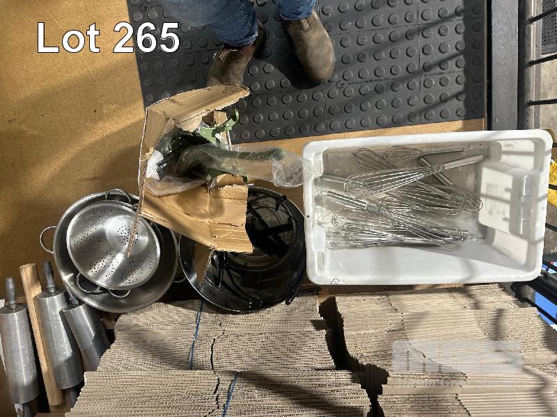 3 x WOKS, 3 x POTS, 10 x WHISKS, ICE BUCKET, 3 x SIEVES, 4 x ROLLING PINS, 2 x STRAINERS, 10 x SMALL SKILLETS, 5 x FRY PANS, 2 x MUFFIN TRAYS & MANUAL OP CHIP CUTTER