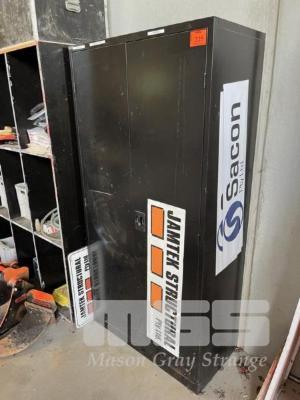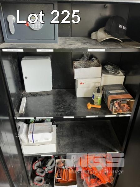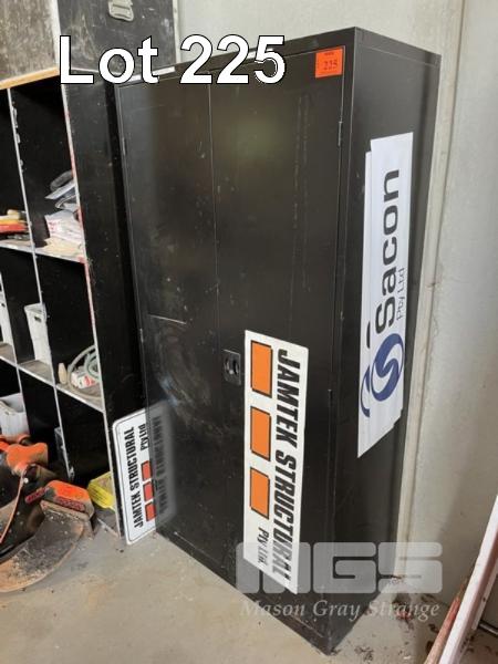 BLACK METAL TOOL CABINET, 2 DOOR, WITH LOCKWOOD COMBINATION MINI SAFE & SUNDRIES