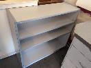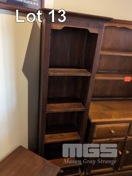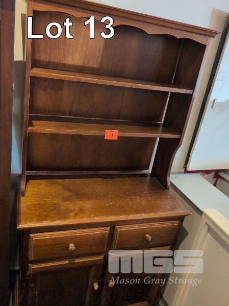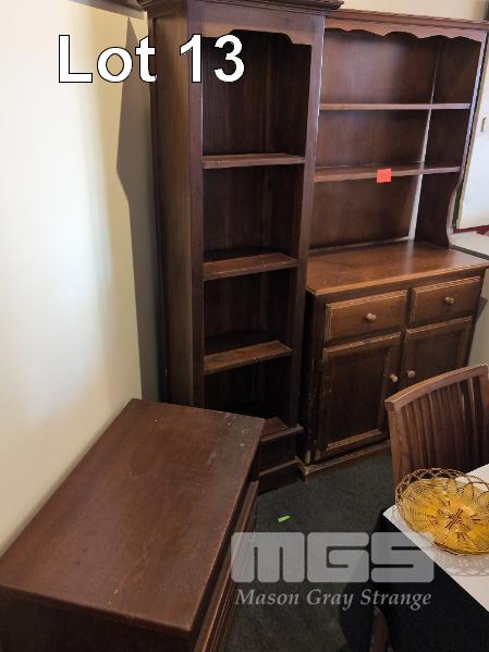 4 X PIECES OF FURNITURE, TIMBER SIDEBOARD CABINET, TIMBER SHELF, TELEVISION CABINET & GREY LAMINATE SHELF