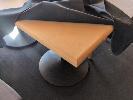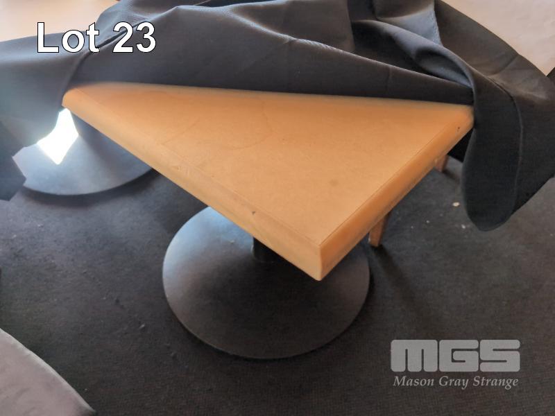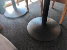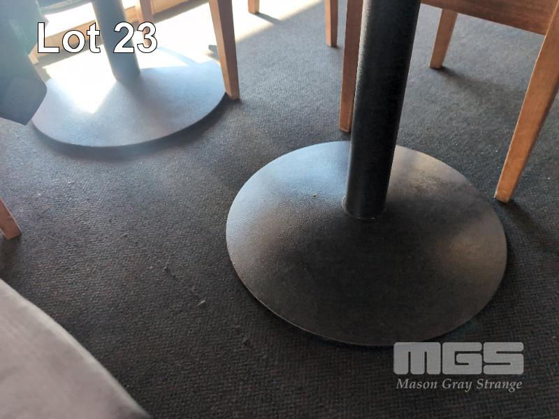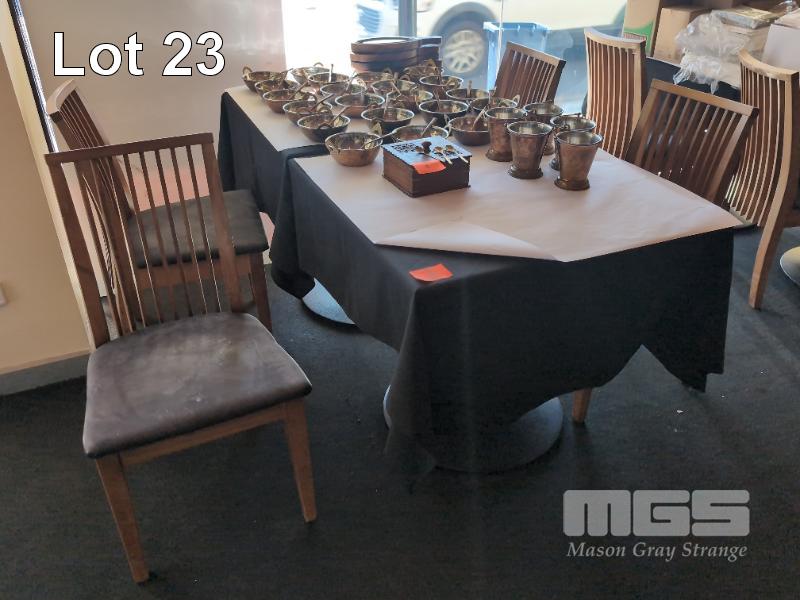 2 X DINING TABLES & 4 X PADDED BENT BACK DINING CHAIRS. TABLES 800 X 800 MM, RAW MDF TOPS WITH HEAVY STEEL BASE INC. TABLECLOTHS.