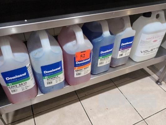 5 X PART CONTAINERS ASSORTED CLEANING CHEMICALS & 1 X PART CONTAINER HAND SOAP.