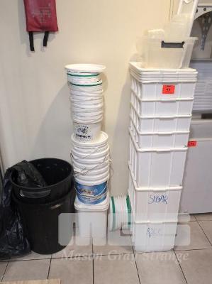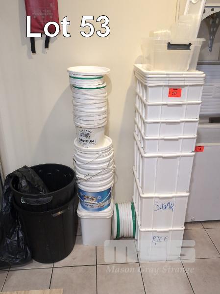 QUANTITY OF FOOD GRADE PLASTIC KITCHEN STORAGE CONTAINERS & 2 X PLASTIC BINS.