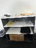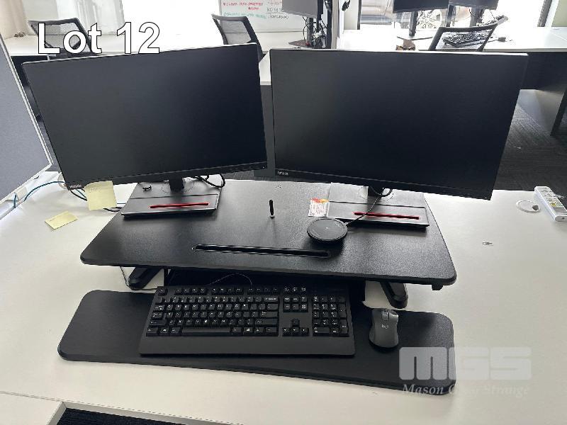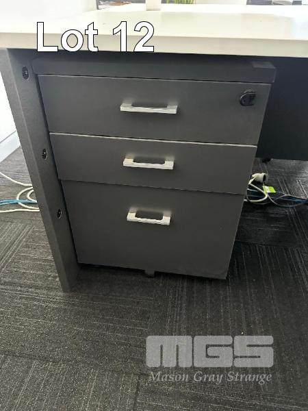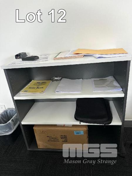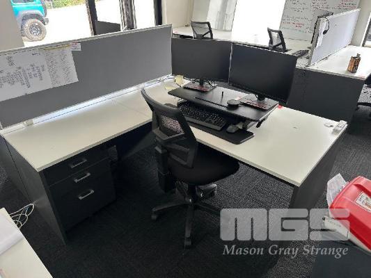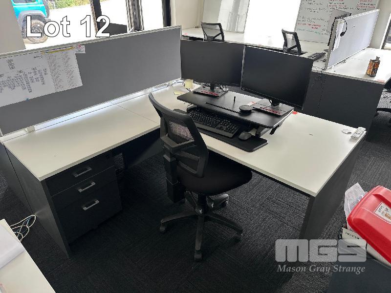 WHITE TIMBER LAMINATE DESK & RETURN, 1800 x 1800mm, 3 DRAWER UNDER DESK MOBILE, BLACK MESH GAS LIFT CHAIR 2 x LENOVO 24" MONITORS, MOD: T24i-20, KEYBOARD & MOUSE, 3 TIER BOOK SHELF, 900 x 350 x 900mm (H)