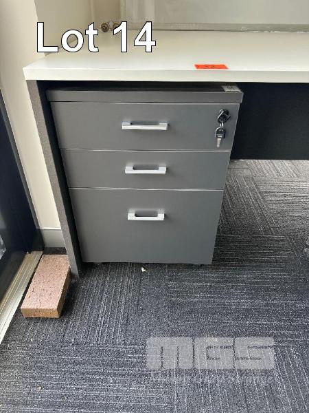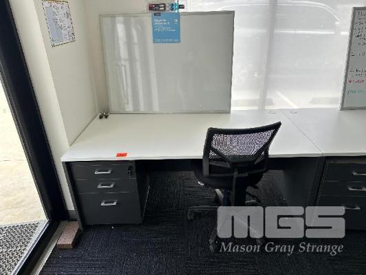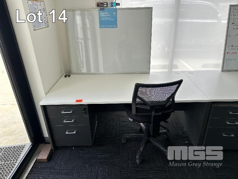 WHITE TIMBER LAMINATE DESK, 1800 x 900mm, 3 DRAWER UNDER DESK MOBILE, BLACK MESH GAS LIFT CHAIR WHITEBOARD, 1200 x 900mm AS NEW!