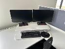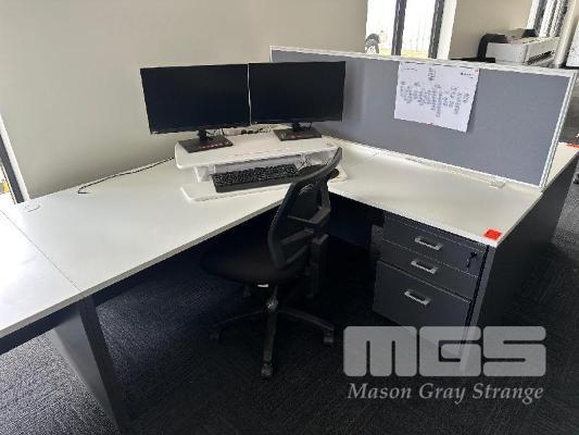 WHITE TIMBER LAMINATE DESK & RETURN, 1800 x 1800mm, PIN BOARD OFFICE PARTITION, MONITOR RISER, 3 DRAWER UNDER DESK MOBILE, BLACK MESH GAS LIFT CHAIR 2 x LENOVO 24" MONITORS, MOD: T24i-20, KEYBOARD & MOUSE