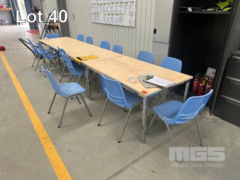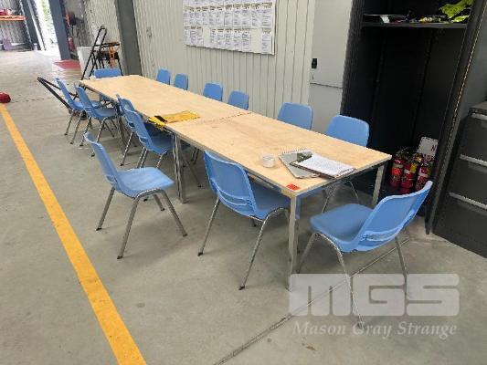 3 x WOODGRAIN LAMINATE TABLES, CHROME FRAMES, 1500 x 900mm, 14 x BLUE STACKABLE CHAIRS WITH CHAIR TROLLEY