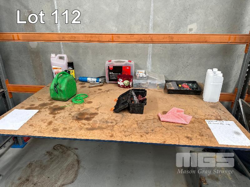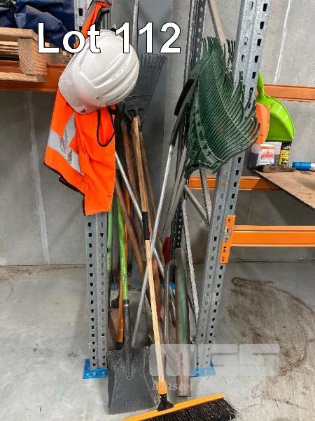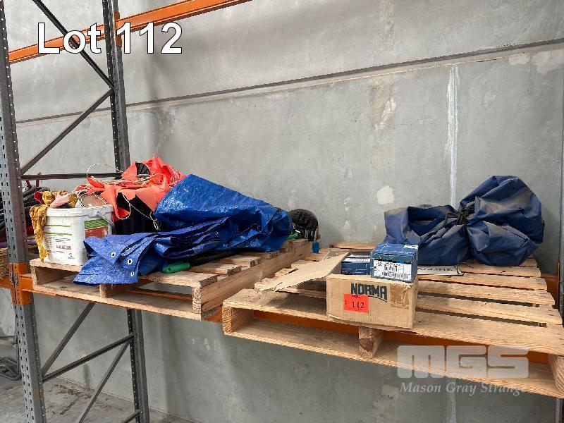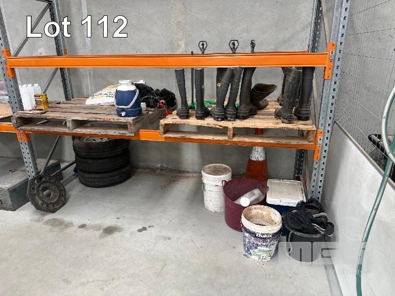 CONTENTS OF PALLET RACKING, LANDSCAPING TOOLS, SPARE TRAILER WHEELS, TARPS, GUMBOOTS ETC.