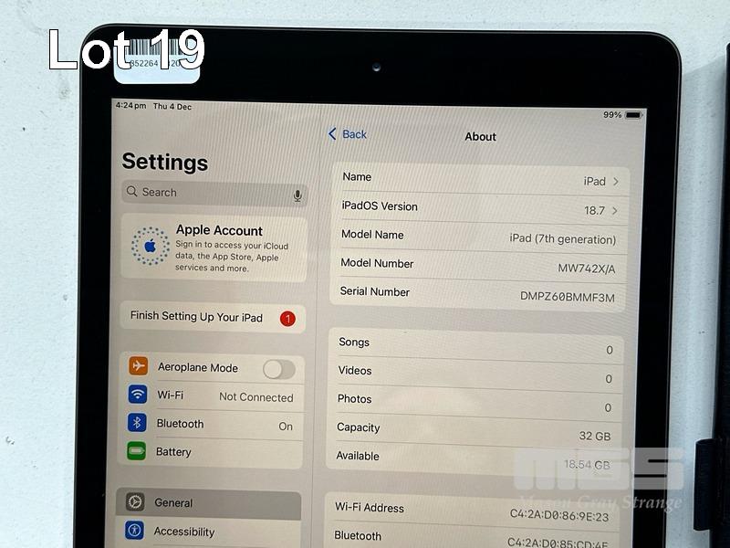 APPLE iPAD 7TH GEN, 32GB, Wi-Fi, SPACE GREY, MODEL MW742X/A, A2197 WITH COVER (NO CABLE, NO CHARGER) S/N:DMPZ60BMMF3M