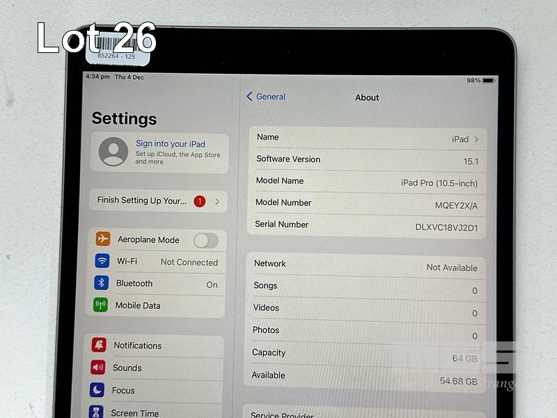 APPLE iPAD PRO, 10.5", 64GB, Wi-Fi, CELLULAR, SPACE GREY, MQEY2X/A, MODEL A1709 (NO CABLE, NO CHARGER) S/N:DLXVC18VJ2D1
