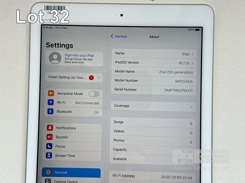 APPLE iPAD 5TH GEN, 32GB, Wi-Fi, SILVER, MODEL MP2G2X/A, A1822 (NO CABLE, NO CHARGER) S/N:DMPTWAJ7HLFC
