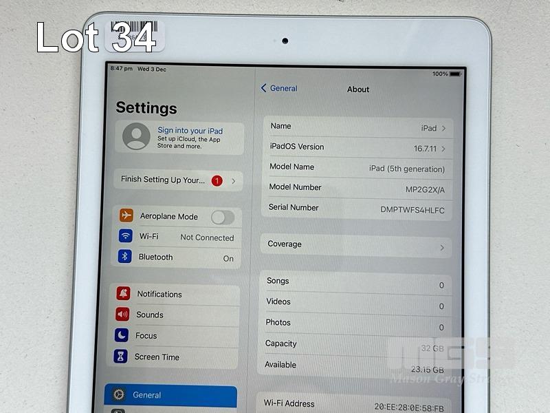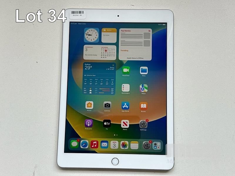 APPLE iPAD 5TH GEN, 32GB, Wi-Fi, SILVER, MODEL MP2G2X/A, A1822 (NO CABLE, NO CHARGER) S/N:DMPTWFS4HLFC
