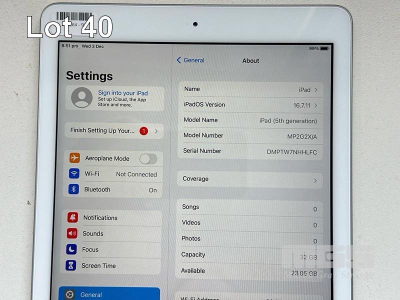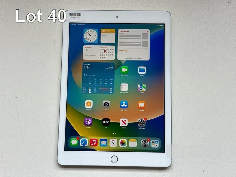APPLE iPAD 5TH GEN, 32GB, Wi-Fi, SILVER, MODEL MP2G2X/A, A1822 (NO CABLE, NO CHARGER) S/N:DMPTW7NHHLFC