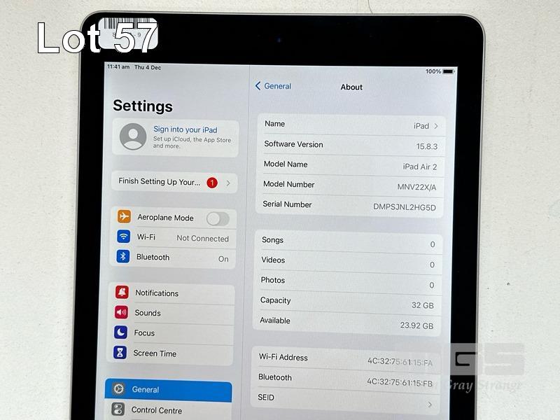 APPLE iPAD AIR 2, 32GB, Wi-Fi, SPACE GREY, MODEL MNV22X/A, A1566 (NO CABLE, NO CHARGER) S/N:DMPSJNL2HG5D
