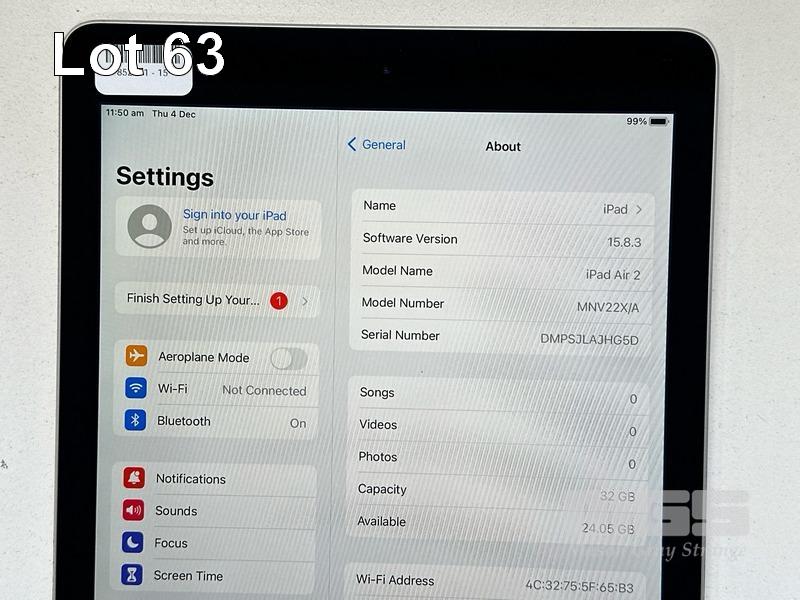 APPLE iPAD AIR 2, 32GB, Wi-Fi, SPACE GREY, MODEL MNV22X/A, A1566 (NO CABLE, NO CHARGER) S/N:DMPSJLAJHG5D