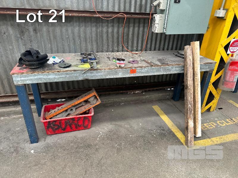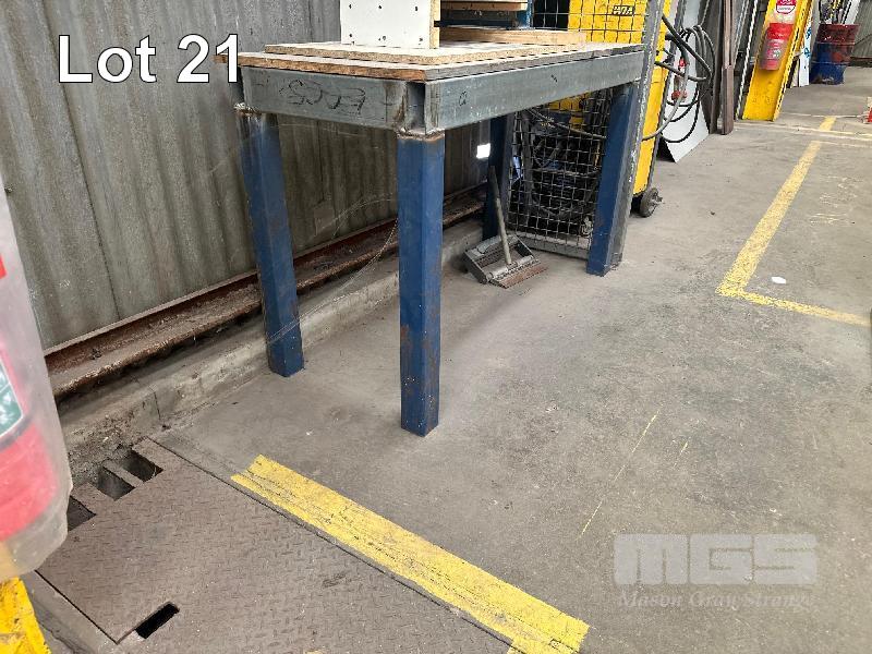 PAIR STEEL FRAME BENCHES, PLYWOOD TOPS, 1400 (L) x 620 (D) x 820mm (H) & 2300 (L) x 620 (D) x 820mm (H)