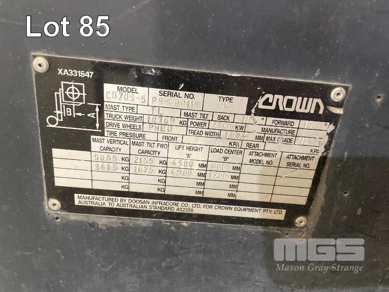 FORKLIFT, CROWN REG: S65SZV MOD: CD70S-5 HOURS: 5,176 BLADE POSITION SIDE SHIFT PNEUMATIC TYRE 4500mm LIFT