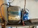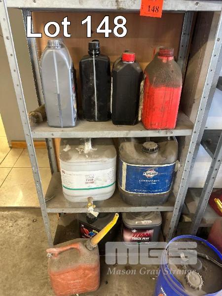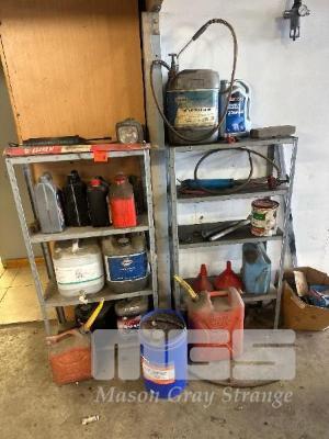 2 x GALV SHELF UNITS & CONTENTS, ASSORTED OILS, ENGINE & GEAR, DRUM PUMP, 2 x GREASE GUNS, 20 LITRE JERRY CAN, WATER JUGS, WIPER BLADES & ASSORTED TRAILER HUBS