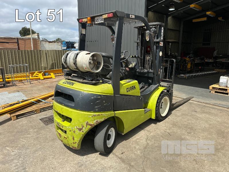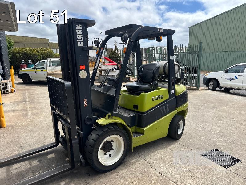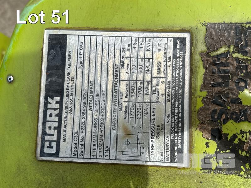 FORKLIFT, CLARK MOD: CL30 LPG SOLID TYRES 3 STAGE CONTAINER MAST 1800mm (L) FORKS HOURS: 2,761