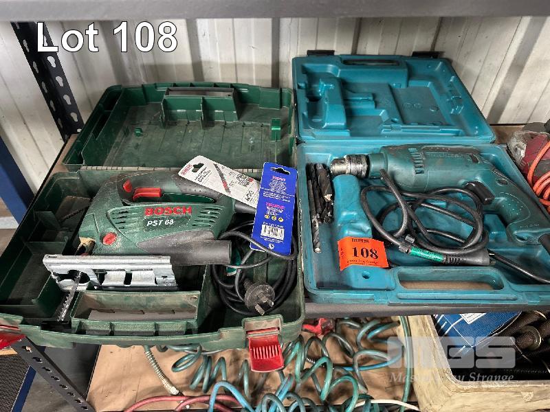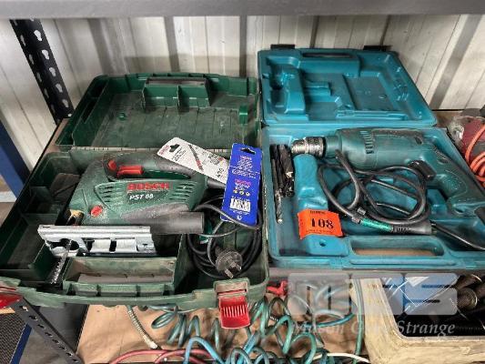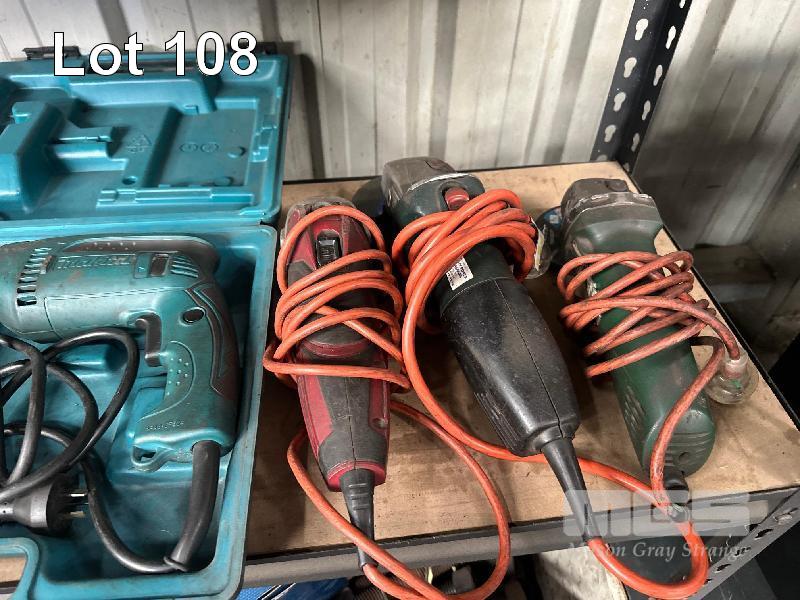ASSORTED POWER TOOLS INCLUDING BOSCH JIGSAW, MAKITA DRILL & 3 x ANGLE GRINDERS, 100-125 240V
