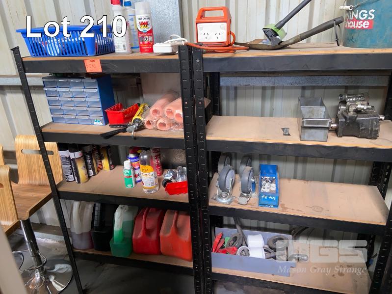 2 x MODULAR SHELF UNITS & CONTENTS INCLUDING PAINTS, OIL, DRAWER SETS, PAINT ROLLERS, CASTORS & HYDRAULIC PUMPS