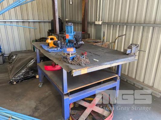 STEEL FRAME BENCH, MOBILE, PLYWOOD TOP & 5" VICE