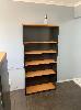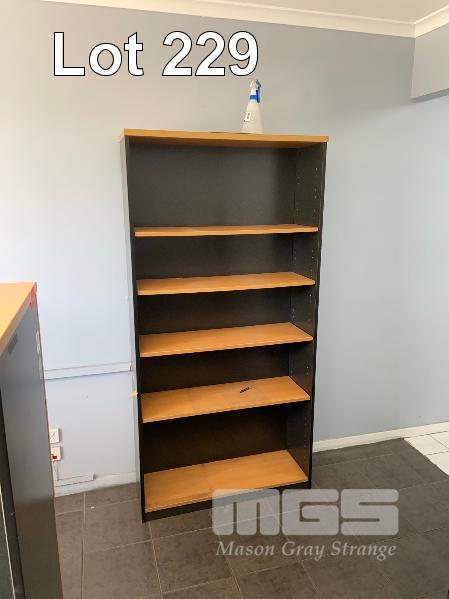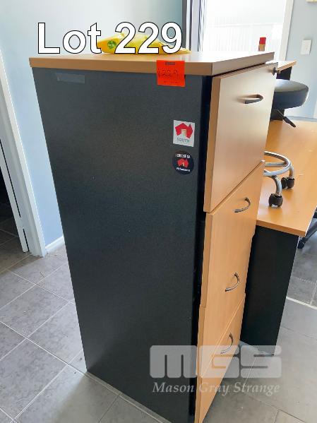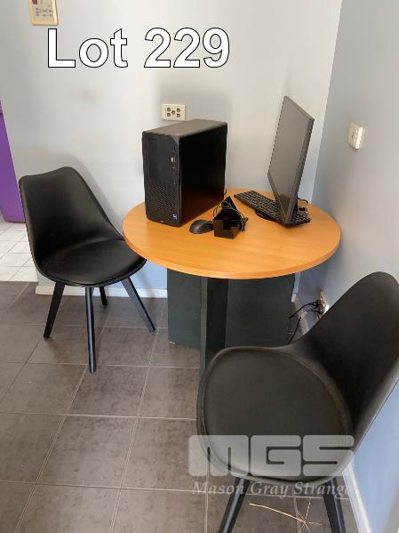 TIMBER LAMINATE RECEPTION COUNTER, 3 DRAWER MOBILE, 4 DRAWER FILING CABINET, BOOK SHELF, ROUND MEETING TABLE, 2 x VISITORS CHAIR & GAS LIFT OFFICE CHAIR AND SMALL STOOL .