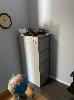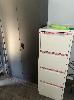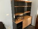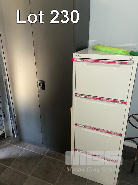 TIMBER LAMINATE DESK & RETURN, 1800 x 1900mm, SIDE CABINET, 2 DOOR, 2 SHELF, 2 x STEEL 4 DRAWER FILING CABINETS, VISITORS CHAIR & GAS LIFT CHAIR