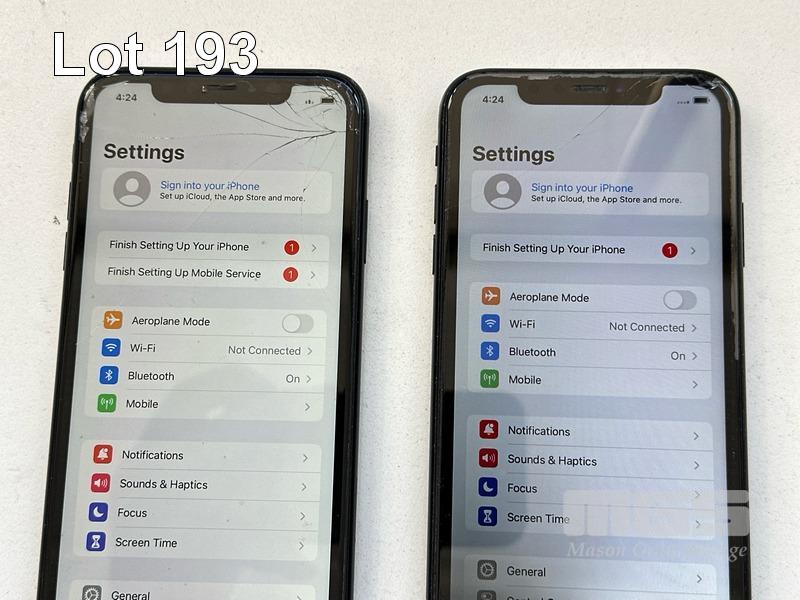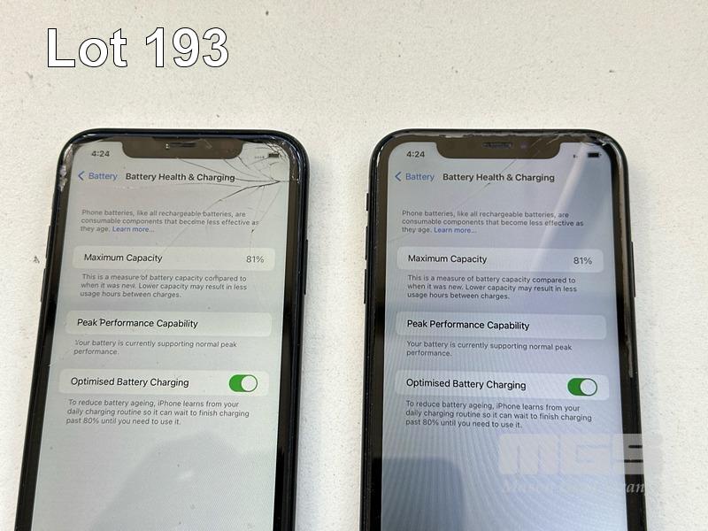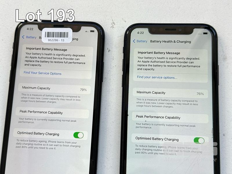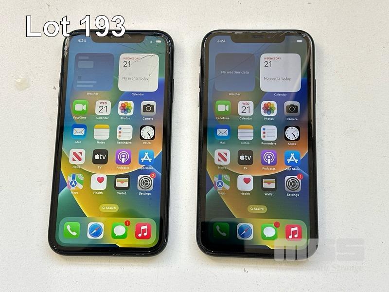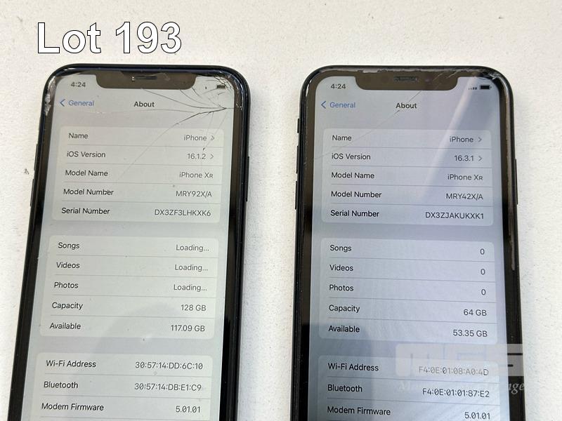4 x APPLE iPHONES INC. - 3 x APPLE iPHONE XR, 64GB, BLACK, MODEL MRY42X/A, A2105, BATTERY HEALTH 79%, 76%, 81% - 1 x APPLE iPHONE XR, 128GB, BLACK, MODEL MRY92X/A, A2105, BATTERY HEALTH 81% (NO CABLE, NO CHARGER) (NOTE: SOME DAMAGED, BATTERY SERVICE MESSAGE) S/N: DX3ZJBW9KXK1, DX3ZH5Y7KXK1, DX3ZF3LHKXK6, DX3ZJAKUKXK1