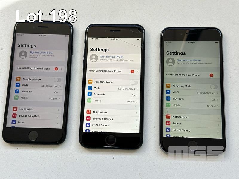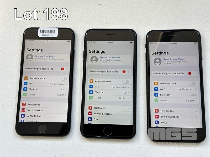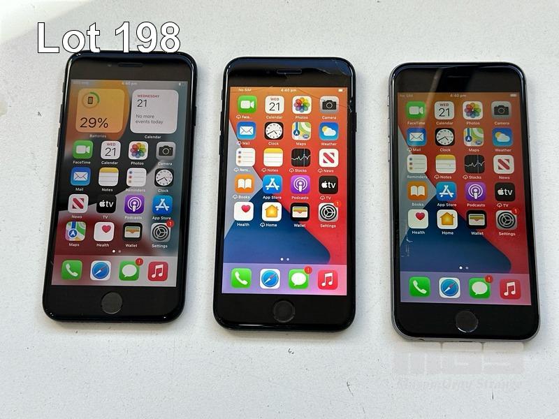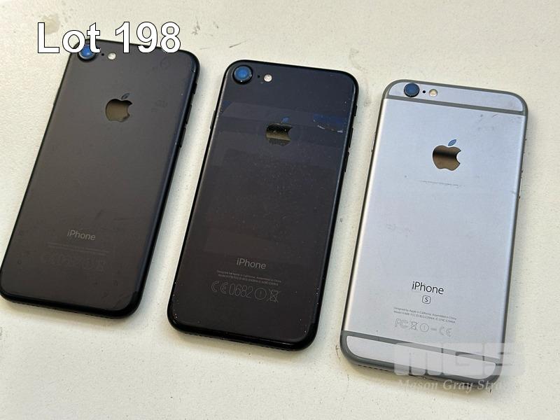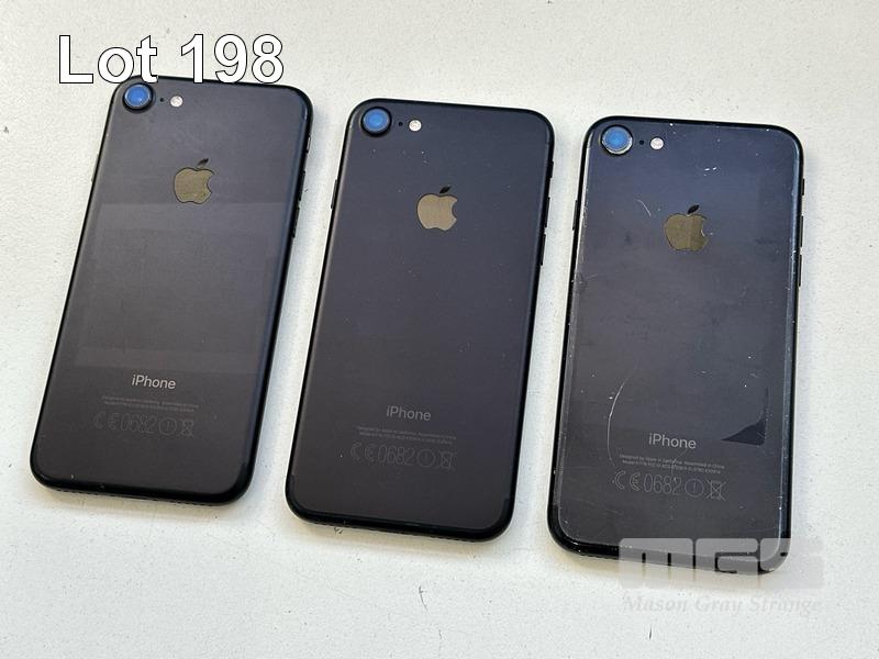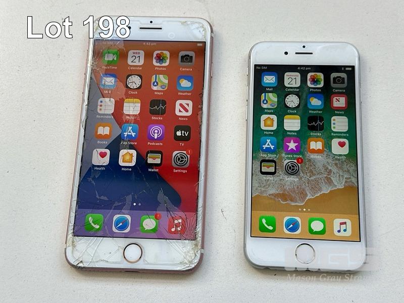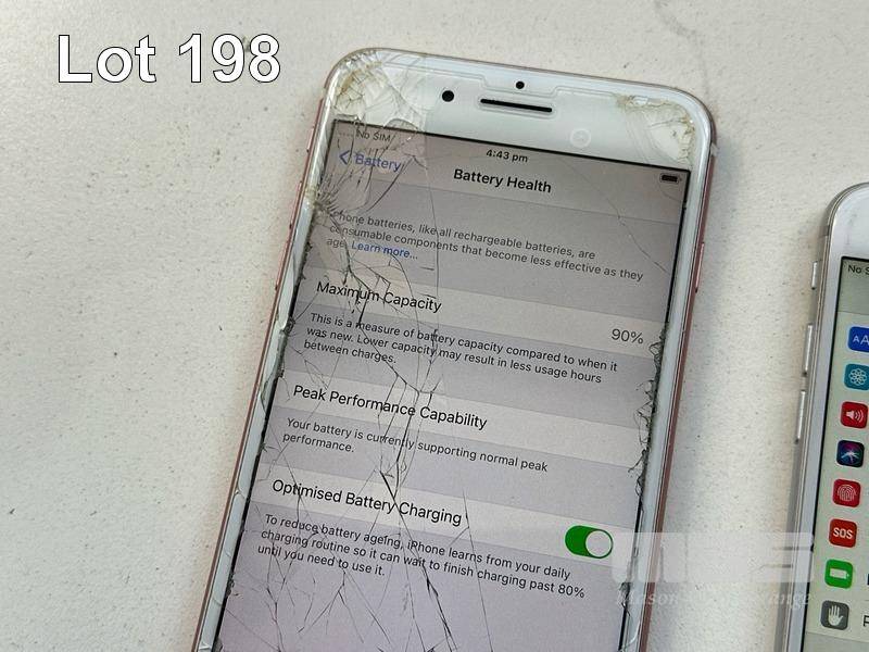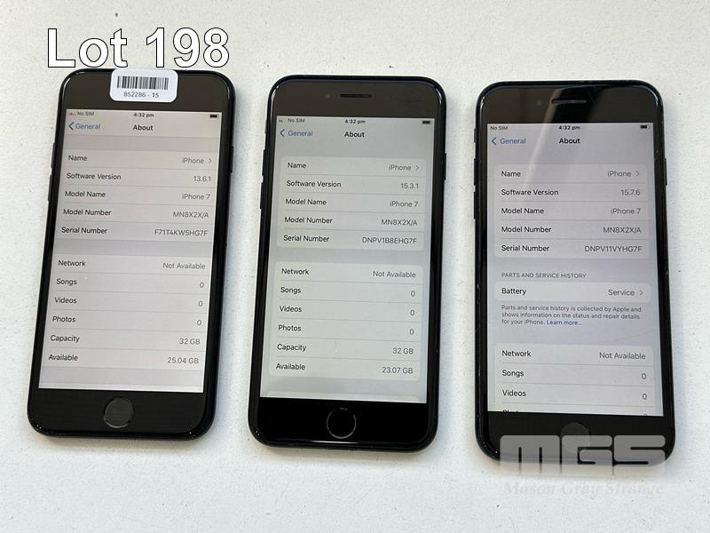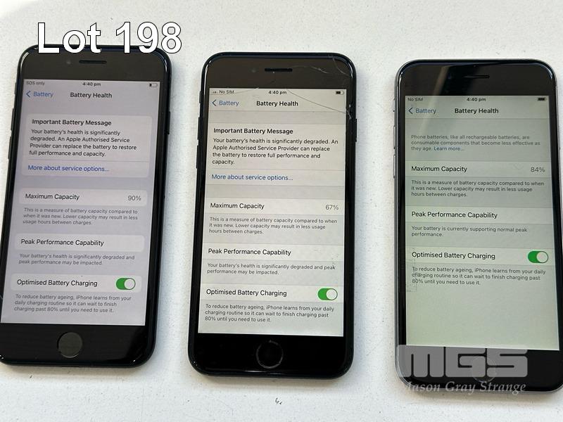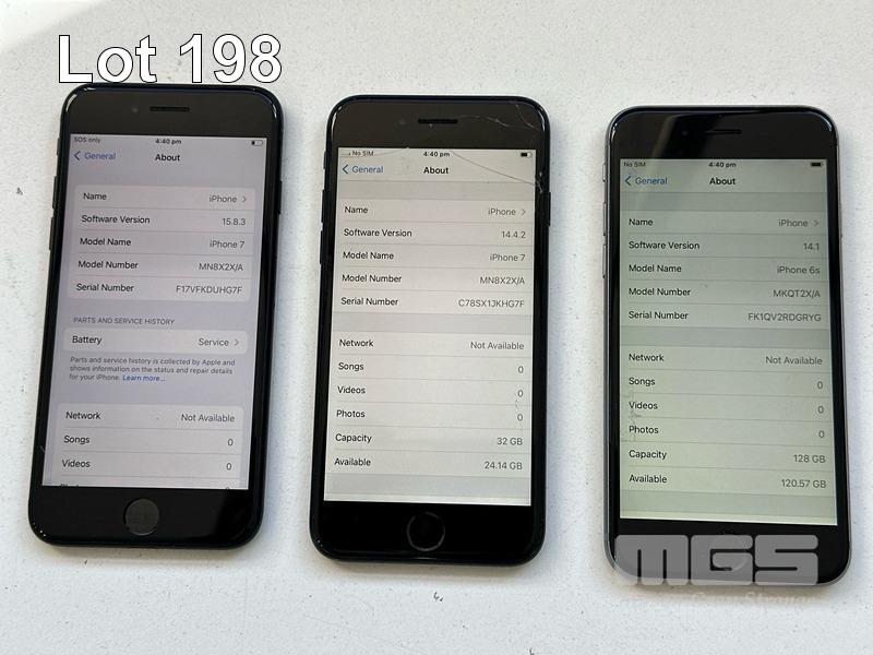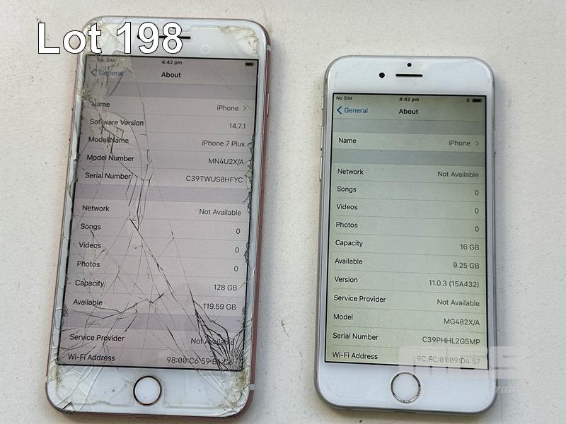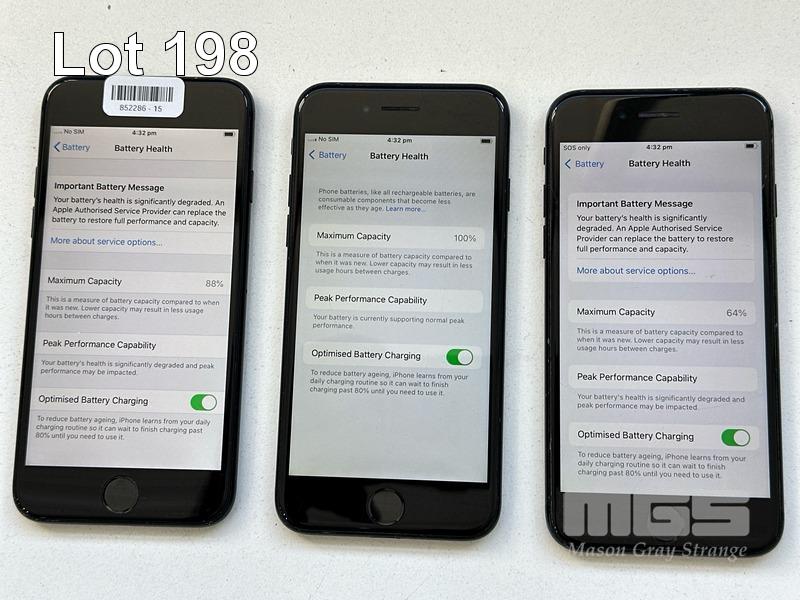 8 x APPLE iPHONES INC. - 5 x APPLE iPHONE 7, 32GB, BLACK, MODEL MN8X2X/A, A1778, BATTERY HEALTH 88%, 100%, 64%, 90%, 67% - 1 x APPLE iPHONE 6s, 128GB, SAPCE GREY, MODEL MKQT2X/A, A1688, BATTERY HEALTH 84% - 1 x APPLE iPHONE 7 PLUS, 128GB, MODEL MN4U2X/A, A1784, BATTERY HEALTH 90% - 1 x APPLE iPHONE 6, 16GB, MODEL MG482X/A, A1586 (NO CABLES, NO CHARGERS) (NOTE: 2 x DAMAGED, SOME WITH BATTERY SERVICE MESSAGE) S/N:F71T4KW5HG7F, DNPV1B8EHG7F, DNPV11VYHG7F, F17VFKDUHG7F, C78SX1JHG7F, FK1QV2RDGRYG, C39TWUS0HFYC, C39PHHL2G5MP