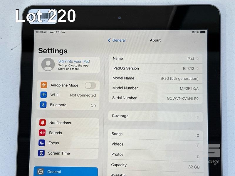 APPLE iPAD 5TH GEN, 32GB, Wi-Fi, SPACE GREY, MODEL MP2F2X/A, A1822 (NO CABLE, NO CHARGER) S/N:GCWVNKV4HLF9