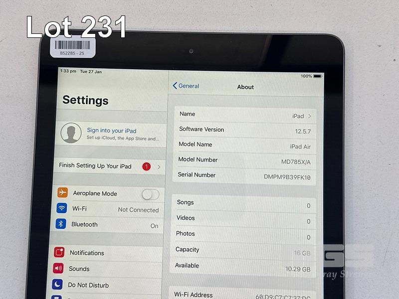 APPLE iPAD AIR, 16GB, Wi-Fi, SPACE GREY, MODEL MD785X/A, A1474 (NO CABLE, NO CHARGER) S/N:DMPM9B39FK10