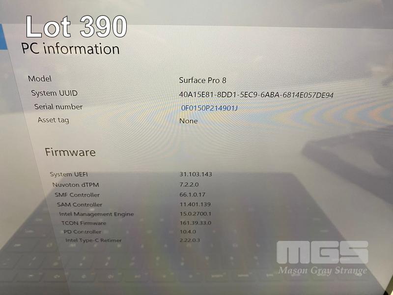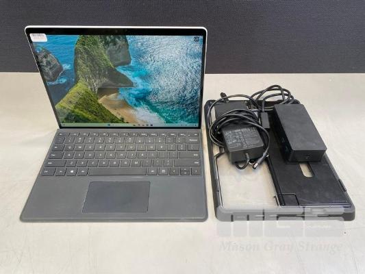 TABLET PC, MICROSOFT SURFACE PRO 8, MODEL 1982, CORE i5 1145G7 (11TH GEN) @ 2.6GHz, 16GB DDR4 RAM, 256GB NVMe M.2 SSD, 13" TOUCHSCREEN (2880x1920), INTEL IRIS Xe GRAPHICS, Wi-Fi, CELLULAR, BLUETOOTH, WINDOWS 11 PRO INSTALLED, KEYBOARD TYPE COVER, CASE, DOCKING STATION & POWER SUPPLY (NO TABLET POWER SUPPLY) (NOTE: MINOR SCRATCHES ON SCREEN) S/N:0F0150P214901J