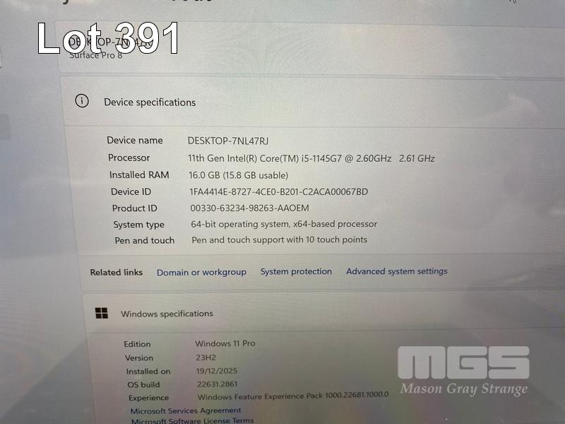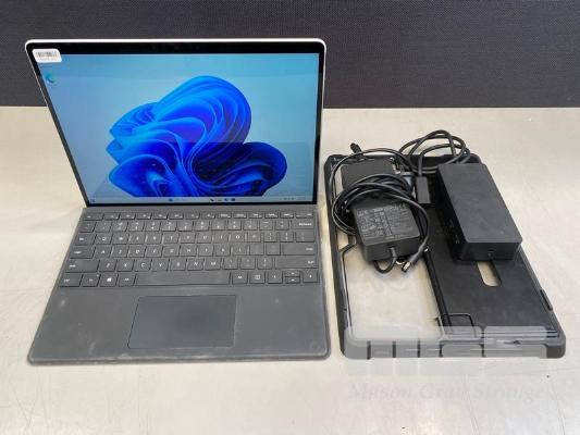 TABLET PC, MICROSOFT SURFACE PRO 8, MODEL 1982, CORE i5 1145G7 (11TH GEN) @ 2.6GHz, 16GB DDR4 RAM, 256GB NVMe M.2 SSD, 13" TOUCHSCREEN (2880x1920), INTEL IRIS Xe GRAPHICS, Wi-Fi, CELLULAR, BLUETOOTH, WINDOWS 11 PRO INSTALLED, KEYBOARD TYPE COVER, CASE, DOCKING STATION & POWER SUPPLY (NO TABLET POWER SUPPLY) (NOTE: SCRATCHES ON SCREEN) S/N:0F014XQ214901J