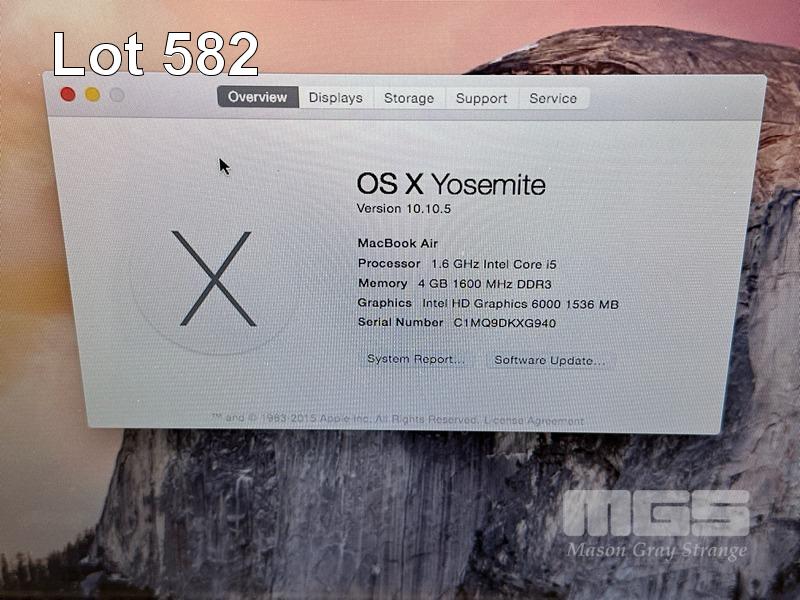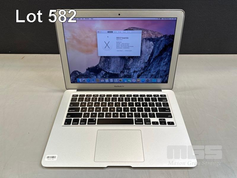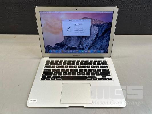 LAPTOP, APPLE MACBOOK AIR (A1466), CORE i5 5250U (5TH GEN) @ 1.6GHz, 4GB DDR3 RAM, 128GB SSD, 13.3" DISPLAY (1440x900), INTEL HD GRAPHICS 6000, Wi-Fi, BLUETOOTH, MAC OS 10.10 INSTALLED & POWER SUPPLY (NOTE: SCREEN HINGES LOOSE) S/N:C1MQ9DKXG940