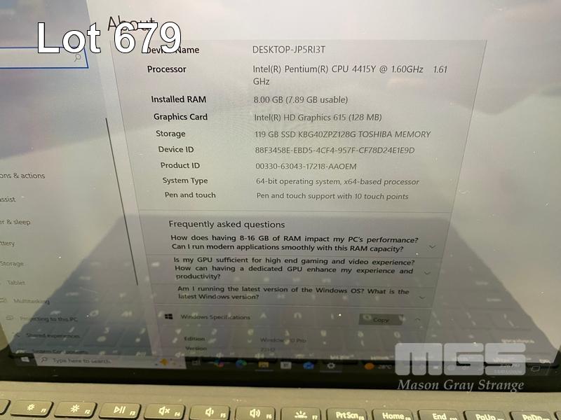 TABLET PC, MICROSOFT SURFACE GO, MODEL 1824, PENTIUM GOLD 4415Y @ 1.6GHz, 8GB DDR3 RAM, 128GB NVMe M.2 SSD, 10" TOUCHSCREEN (1800x1200), INTEL HD GRAPHICS 615, Wi-Fi, BLUETOOTH, WINDOWS 10 PRO INSTALLED, KEYBOARD TYPE COVER & POWER SUPPLY S/N:00645395251