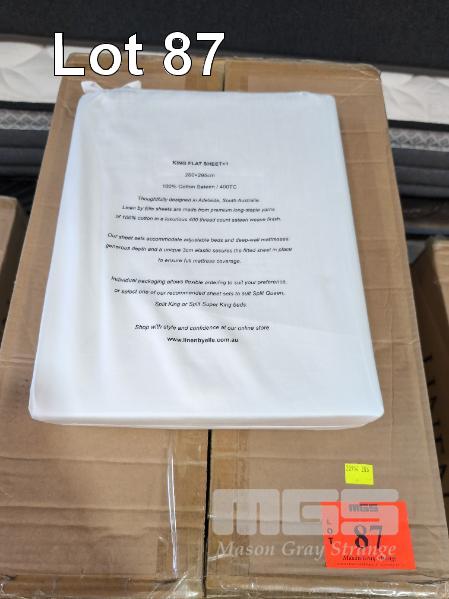 25 X KING FLAT SHEETS. 2,600 X 2,950 MM. 100% COTTON SATEEN / 400TC. WHITE.